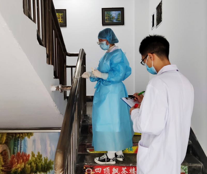 采样人员采集电梯按钮、门把手、操作键盘按钮,楼梯扶手、台面等人员容易接触的部位,同时对工作人员手、洗手间、垃圾桶、化粪池等重点部位和场所进行采样检测,共采集样本量高达 200份。 绝不遗漏任何感染风险点,同时现场督促卫生消毒工作落实情况,提出改进措施。