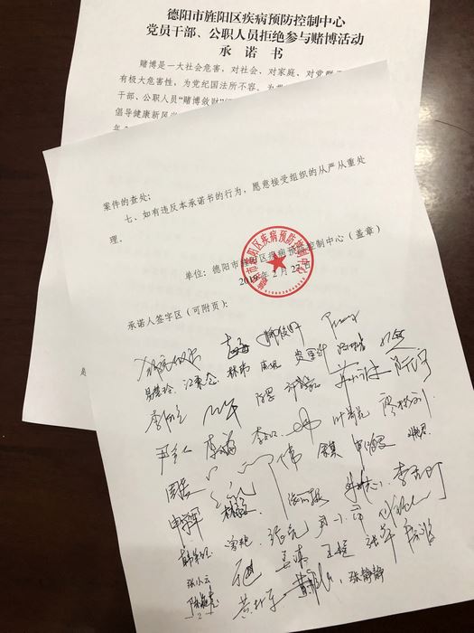 为深入贯彻全面从严治党战略部署,按照区纪委、监察委相关文件要求,2019年3月7日,区疾控中心开展了“赌博敛财”问题专项整治学习,并组织全体党员干部、公职人员签订拒绝参与赌博活动承诺书。