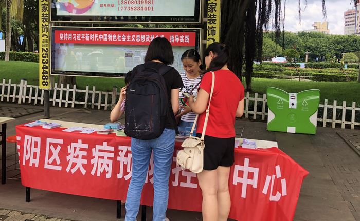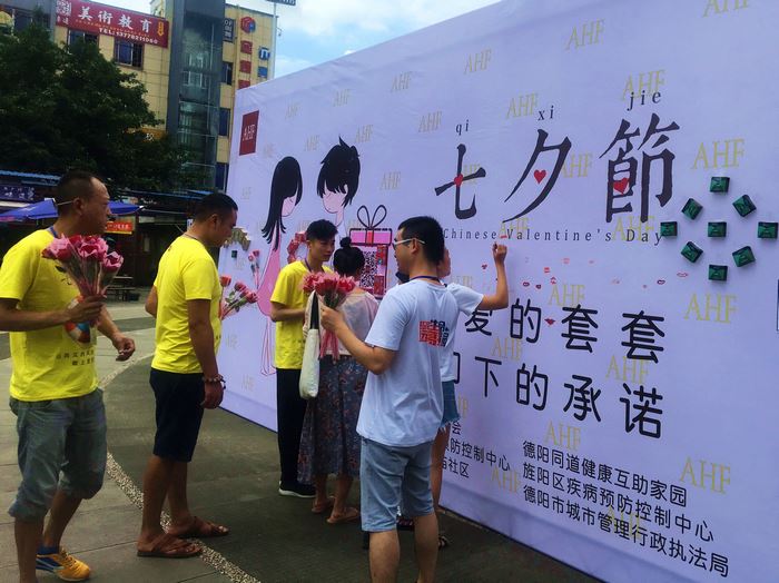 七夕节来临之际,旌阳区疾控中心联合德阳市疾控中心、德阳同道健康互助家园在文庙广场开展主题为“远离艾的风险,带上爱的救生圈”七夕防艾公益宣传活动。
