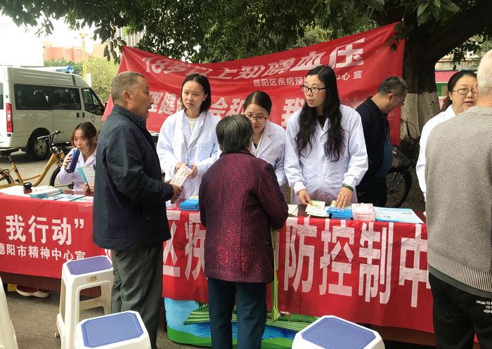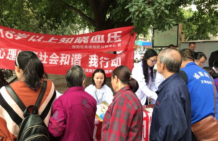 2019年10月8日是第22个“全国高血压日”,10月10日是第28个“世界精神卫生日” 为进一步普及高血压防治知识和宣传心理健康相关知识,营造良好的社会氛围,10月9日市区疾控中心、市精神卫生中心和城南社区卫生服务中心在城南珠江西路社区开展全国高血压日和精神卫生日宣传活动活动。10月10日上午旌阳区疾控中心、泰山社区卫生服务中心和德阳乐龄精神医院在淮河路社区开展“心理健康社会和谐,我行动”重精知识讲座,宣传心理健康知识,帮助人们进一步提高对心理健康的认识。