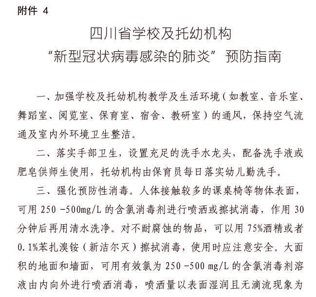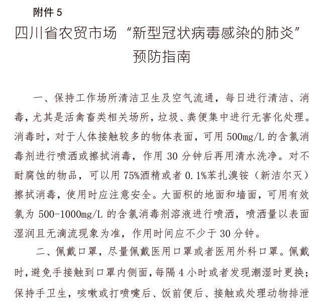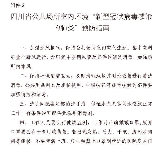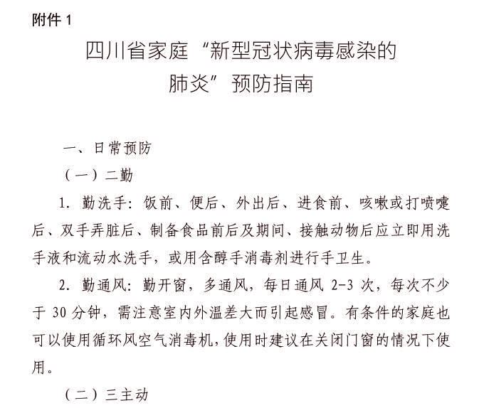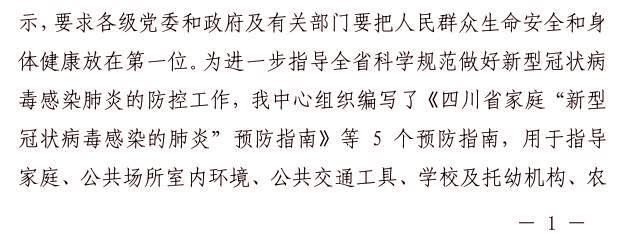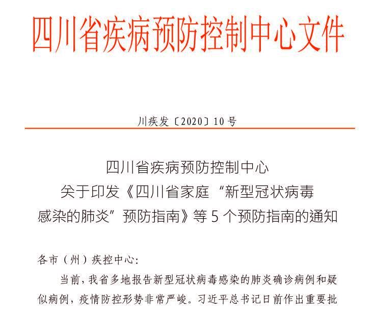 1月30日,为全力做好新型冠状病毒感染的肺炎疫情防控工作,有效遏制疫情传播,切实保障人民群众生命安全和身体健康,四川省疾病预防控制中心编写了《四川省家庭“新型冠状病毒感染的肺炎”预防指南》《四川省公共场所室内环境“新型冠状病毒感染的肺炎”预防指南》《四川省公共交通工具“新型冠状病毒感染的肺炎”预防指南》《四川省学校及托幼机构“新型冠状病毒感染的肺炎”预防指南》《四川省农贸市场“新型冠状病毒感染的肺炎”预防指南》。