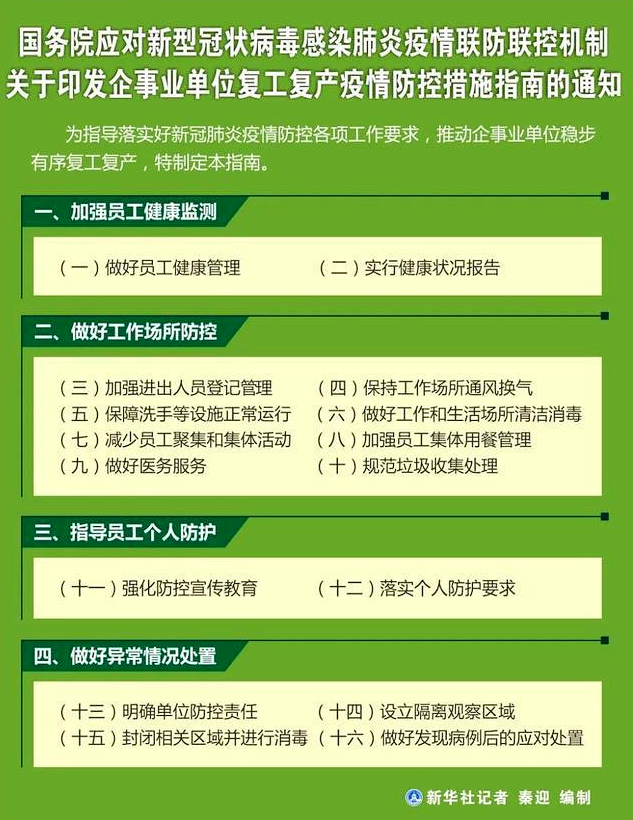 为指导落实好新冠肺炎疫情防控各项工作要求,推动企事业单位稳步有序复工复产,特制定本指南。