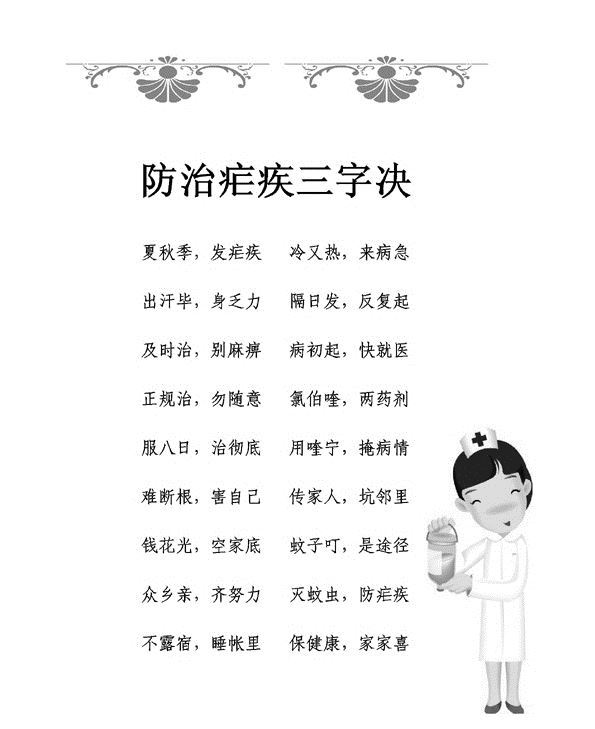 疟疾是由疟原虫引起的、以周期性发冷、发热、出汗等症状和脾大、贫血等体征为特点的寄生虫病,民间常称之为“打摆子”,分为间日疟,恶性疟,三日疟和卵形疟4种。