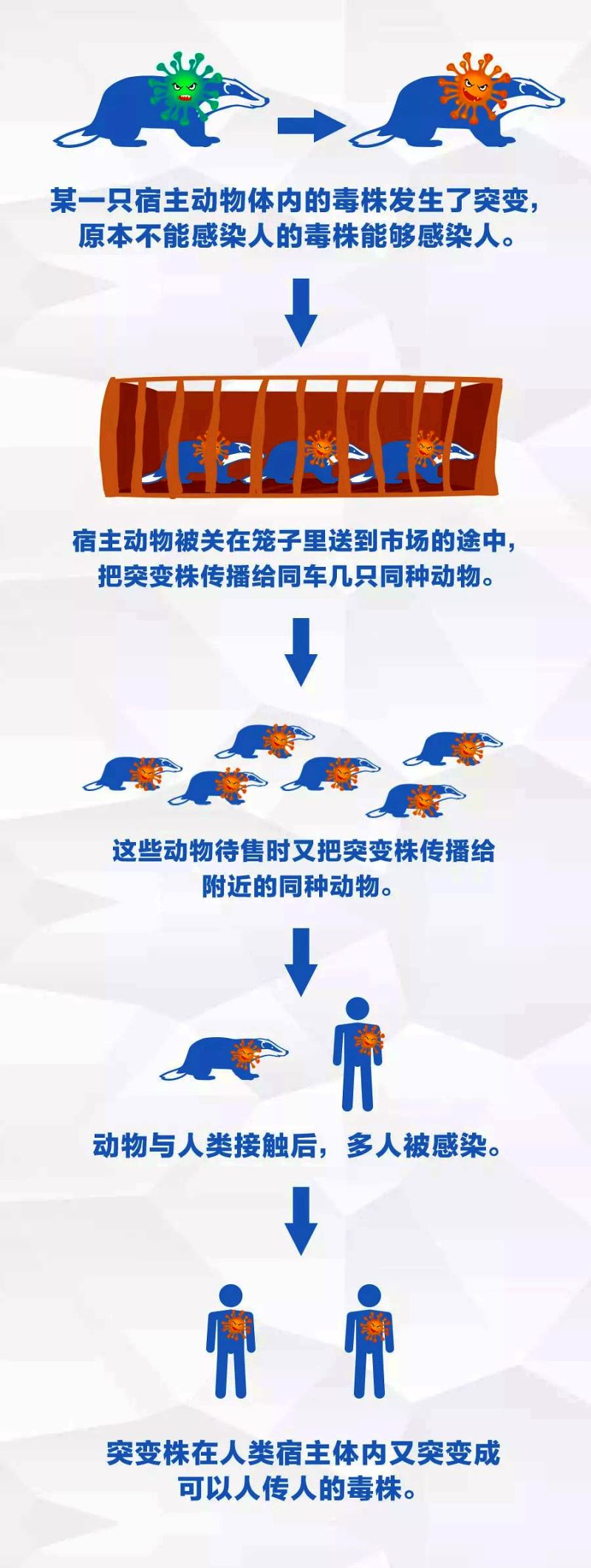 野味市场是疫情最先爆发的地点。近来的几次冠状病毒严重疫情,都是通过其他脊椎动物感染人的。目前看来,很可能是这样一种情况: