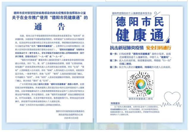 2月29日,市应对新冠肺炎疫情应急指挥部办公室发布通告,在全市推广使用“德阳市民健康通”。