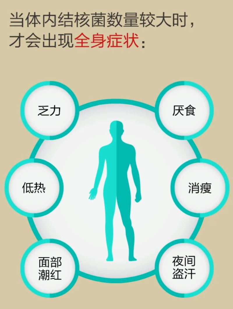 肺结核以咳嗽咳痰2周以上或痰中带血为常见症状,此外还有低烧、夜间盗汗、午后发热、胸痛、疲乏无力、体重减轻、呼吸困难等。